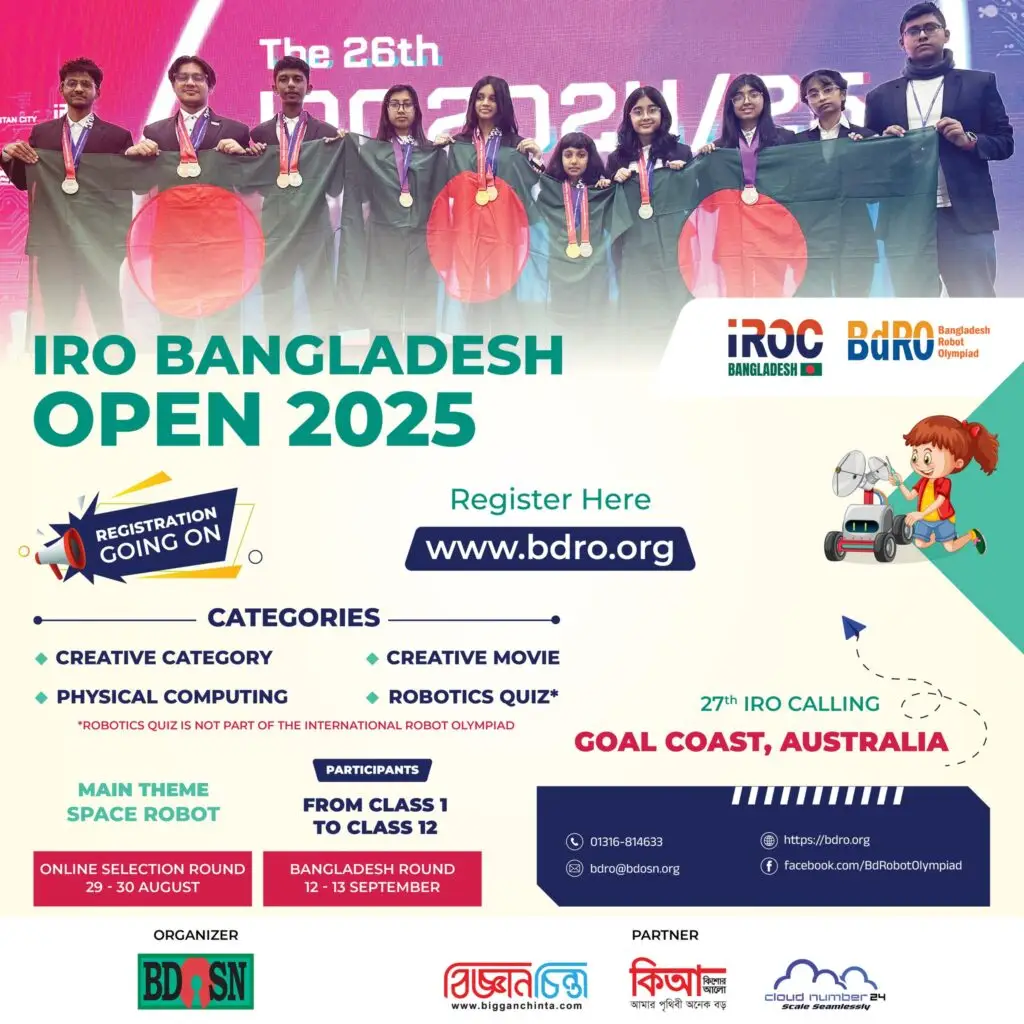 টেকসিঁড়ি রিপোর্ট : আইআরও বা ইন্টারন্যাশনাল রোবট অলিম্পিয়াড, বাংলাদেশ ওপেন ২০২৫ এর জন্য নিবন্ধন শেষ হচ্ছে আজ , ২০ আগস্ট ।
