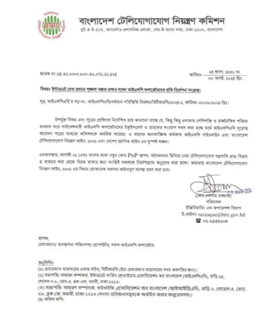 আরও বলা হয়, আগামী ১ মাসের মধ্যে নতুন কোন POP স্থাপন , অবৈধভাবে ছিনিয়ে নেয়া টেলিযোগাযোগ যন্ত্রপাতি ক্রয় বিক্রয় ও ব্যবহার করা থেকে বিরত থাকার জন্য সংশ্লিষ্ট সকলকে নির্দেশক্রমে অনুরোধ করা হলো। অন্যথায় বাংলাদেশ টেলিযোগাযোগ নিয়ন্ত্রণ আইন, ২০০১ এর বিধান মোতাবেক যথাযথ আইনানুগ ব্যবস্থা গ্রহণ করা হবে।