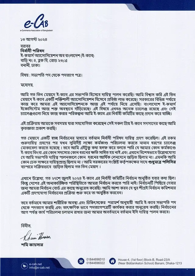 মঙ্গলবার (১৩ আগস্ট) ই-ক্যাবের নির্বাহী পরিষদ বরাবর নিজের পদত্যাগ পত্র জমা দেন তিনি। একই সঙ্গে পদত্যাগপত্রটি তাৎক্ষণিকভাবে কার্যকরের অনুরোধ করেন তিনি।
