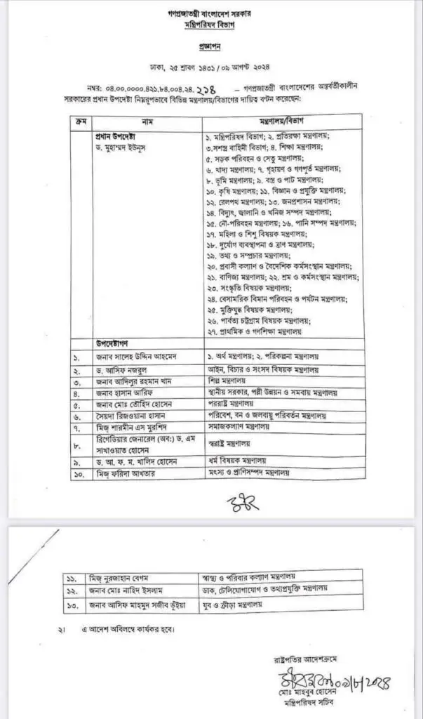 এর আগে বৃহস্পতিবার (৮ আগস্ট) রাত ৯ টায় প্রধান উপদেষ্টা হিসেবে নেন শান্তিতে নোবেলজয়ী  ড. মুহাম্মদ ইউনূস। শপথ নিয়েছেন ড. ইউনূসের নেতৃত্বে অন্তর্বর্তীকালীন সরকারের আরো ১৬ উপদেষ্টা। বঙ্গভবনে রাষ্ট্রপতি মো. সাহাবুদ্দিন তাদের শপথ পাঠ করান।