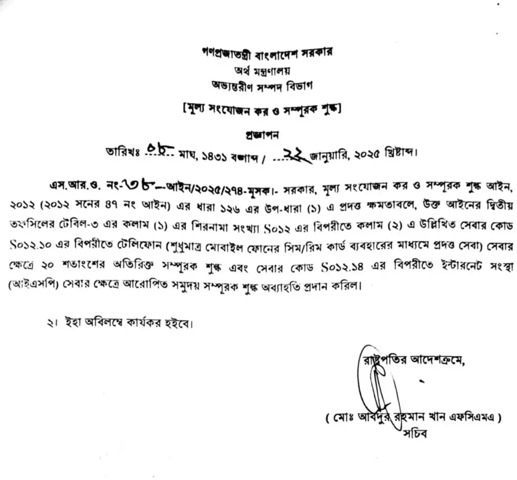 প্রজ্ঞাপন অনুযায়ী, দেশের চলমান ডিজিটাইজেশন কার্যক্রম অব্যাহত রাখা ও একটি আধুনিক আইটি জ্ঞানসম্পন্ন তরুণ প্রজন্ম বির্নিমান এবং অনলাইনভিত্তিক কর্মকান্ড বৃদ্ধির লক্ষ্যে মোবাইল ফোনের সিম/রিম কার্ড ব্যবহারের মাধ্যমে প্রদত্ত সেবার উপর বর্ধিত সম্পূরক শুল্ক এবং আইএসপি সেবার ওপর নতুন আরোপিত সম্পূরক শুল্ক সম্পূর্ণ প্রত্যাহার করা হয়েছে। মোবাইল ফোন ও আইএসপি সেবার উপর বর্ধিত বা নতুন আরোপিত সম্পূরক শুল্ক সম্পূর্ণ প্রত্যাহার করায় এই দুই খাতে ভোক্তাদের খরচ বাড়বে না।