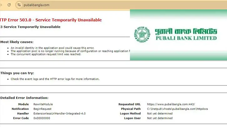 টেকসিঁড়ি রিপোর্টঃ পূবালী ব্যাংকের সাইটে সাইবার হামলার দাবি হ্যাকার গ্রুপের। আজ শনিবার দুপুর ১২ টায় ব্যাংকের সাইটটি ভিজিটে দেখা যায় “এইচটিটিপি এরর 503 – সার্ভিস টেমপোরারিলি আনএভেইলেবল”।