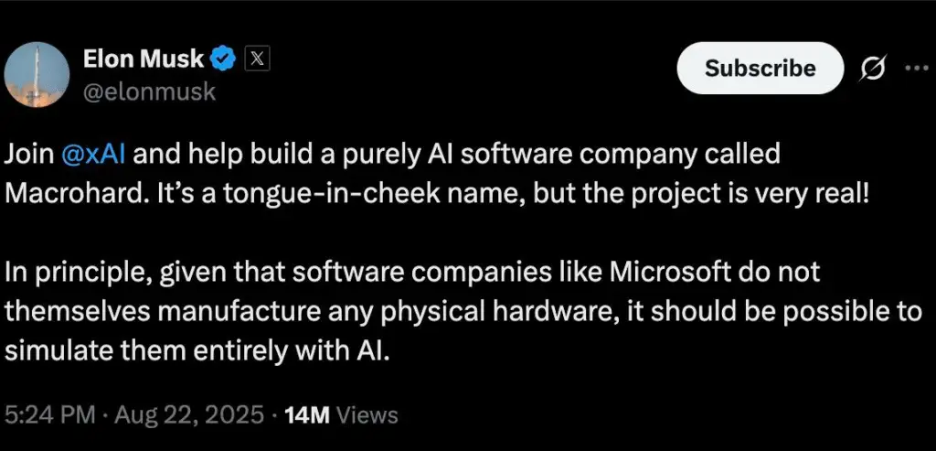মাস্ক তার সোশ্যাল মিডিয়া প্ল্যাটফর্ম এক্স ‘-এ ঘোষণা করেছেন যে, ম্যাক্রোহার্ড হবে একটি ‘বিশুদ্ধ এআই সফটওয়্যার কোম্পানি’। এর লক্ষ্য হলো, কৃত্রিম বুদ্ধিমত্তা ব্যবহার করে এমন সফটওয়্যার তৈরি করা যা প্রচলিত সফটওয়্যার কোম্পানির কাজ সম্পূর্ণভাবে অনুকরণ করতে সক্ষম।