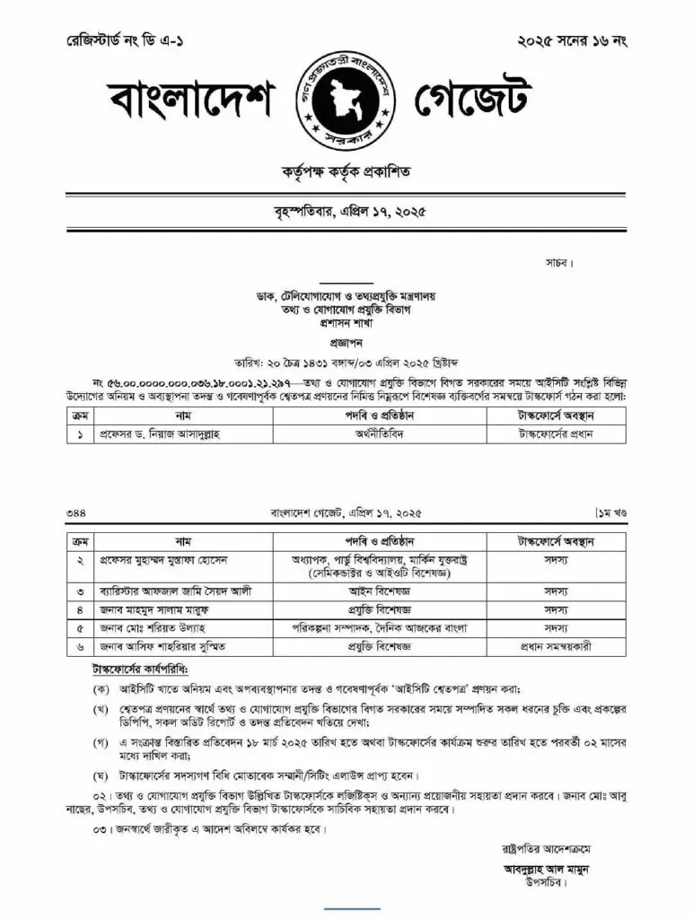 টেকসিঁড়ি রিপোর্ট : তথ্য ও যোগাযোগ প্রযুক্তি খাতের বিভিন্ন প্রকল্পের অনিয়ম এবং দুর্নীতি তদন্তে এবং শ্বেতপত্র প্রণয়নে টাস্কফোর্স গঠন করা হয়েছে।