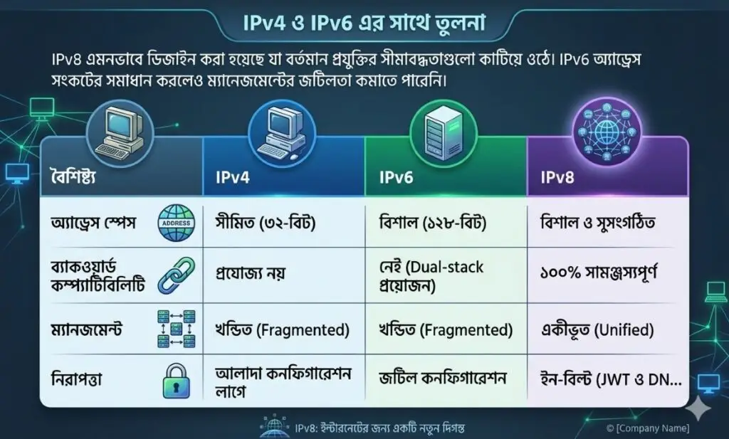 ইন্টারনেটের অস্থির যাত্রায় আজ এক নতুন মোড়। যখন বিশ্ব IPv4-এর ঠিকানা শেষ হওয়ার সমস্যা থেকে বেরিয়ে IPv6-তে স্থানান্তরিত হওয়ার প্রক্রিয়ায় আছে, তখনই ইন্টারনেট ইঞ্জিনিয়ারিং টাস্ক ফোর্স (IETF)-এ জমা পড়েছে এক নতুন প্রস্তাব, ইন্টারনেট প্রোটোকল ভার্সন ৮ (IPv8)। এই প্রস্তাবটি প্রযুক্তি জগতে আলোড়ন তুলেছে। তবে এটি নিয়ে প্রশ্ন থেকেই গেছে। এই প্রতিবেদনে আমরা জানবো IPv8 আসলে কী, এর সুবিধা কী, বর্তমান IPv4 ও IPv6 থেকে এটি কতটা আলাদা এবং কেন এর ভবিষ্যৎ নিয়ে সংশয় রয়েছে।