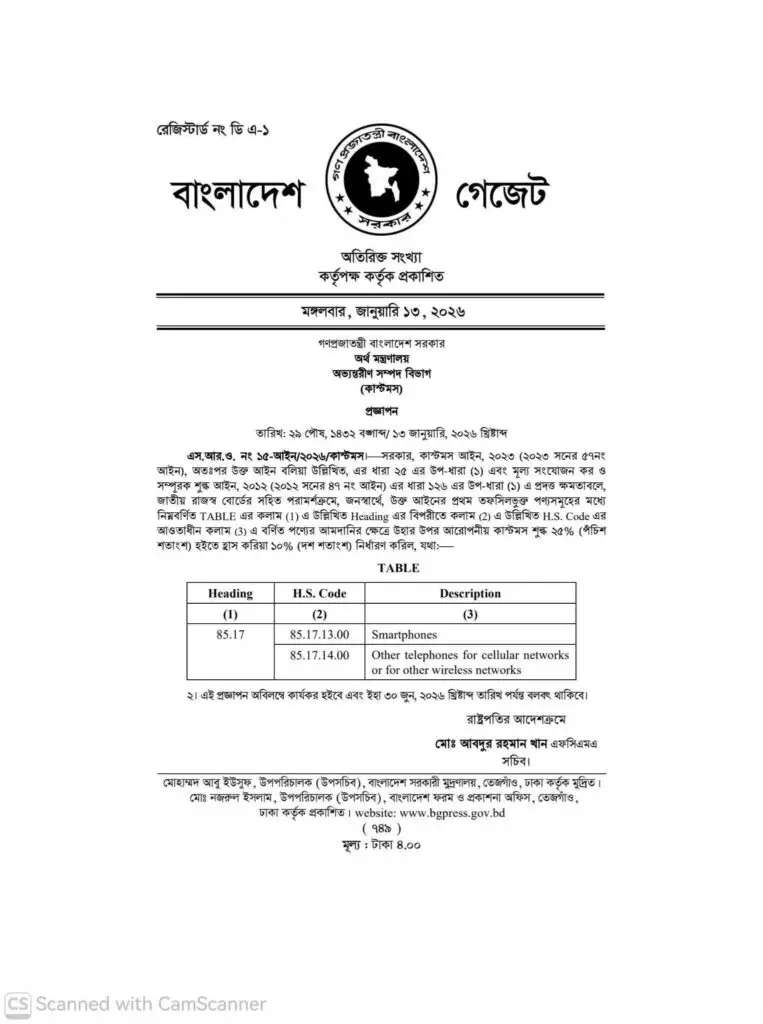 টেকসিঁড়ি রিপোর্টঃ মোবাইল ফোনের দাম ক্রেতা সাধারণের ক্রয় ক্ষমতার মধ্যে রাখার উদ্দেশ্যে মোবাইল ফোন আমদানিতে কাস্টমস ডিউটি ২৫% হতে কমিয়ে ১০% করে আজ প্রজ্ঞাপণ জারি করেছে জাতীয় রাজস্ব বোর্ড। এতে মোবাইল ফোন আমদানিতে প্রযোজ্য বিদ্যমান আমদানি শুল্ক ৬০% কমেছে। তবে এই প্রজ্ঞাপণ ৩০ জুন , ২০২৬ অব্দি জারি থাকবে বলে উল্লেখ করা হয়েছে।