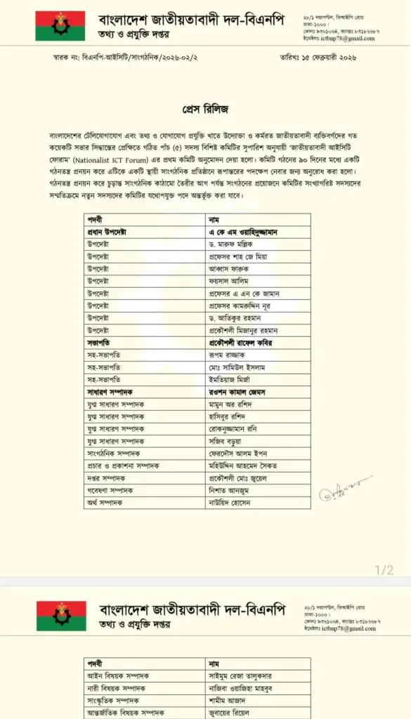 দেশের টেলিযোগাযোগ ও তথ্য-যোগাযোগ প্রযুক্তি (আইসিটি) খাতের উদ্যোক্তা ও পেশাজীবীদের সমন্বয়ে ‘জাতীয়তাবাদী আইসিটি ফোরাম’-এর প্রথম পূর্ণাঙ্গ কমিটি অনুমোদন দেওয়া হয়েছে।