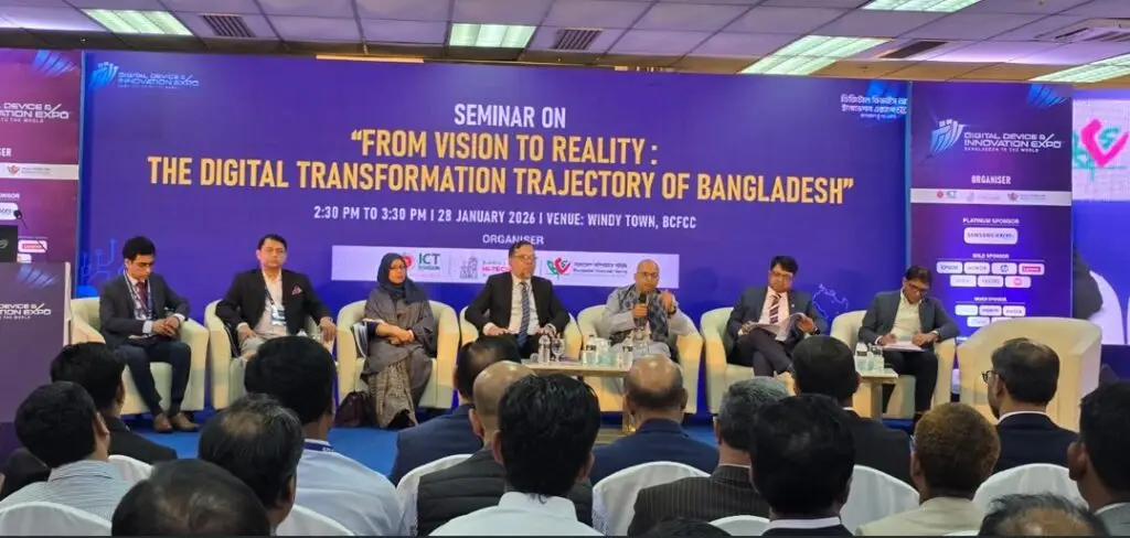 ডিজিটাল ডিভাইস অ্যান্ড ইনোভেশন এক্সপো ২০২৬-এর প্রথম দিন বিকেলে ২:৩০ মিনিটে বাংলাদেশ-চীন মৈত্রী সম্মেলন কেন্দ্রের উইন্ডি টাউনে ‘ফ্রম ভিশন টু রিয়্যালিটি: দ্য ডিজিটাল ট্রান্সফরমেশন ট্রাজেক্টরি অব বাংলাদেশ’ শীর্ষক সেমিনার অনুষ্ঠিত হয়েছে।