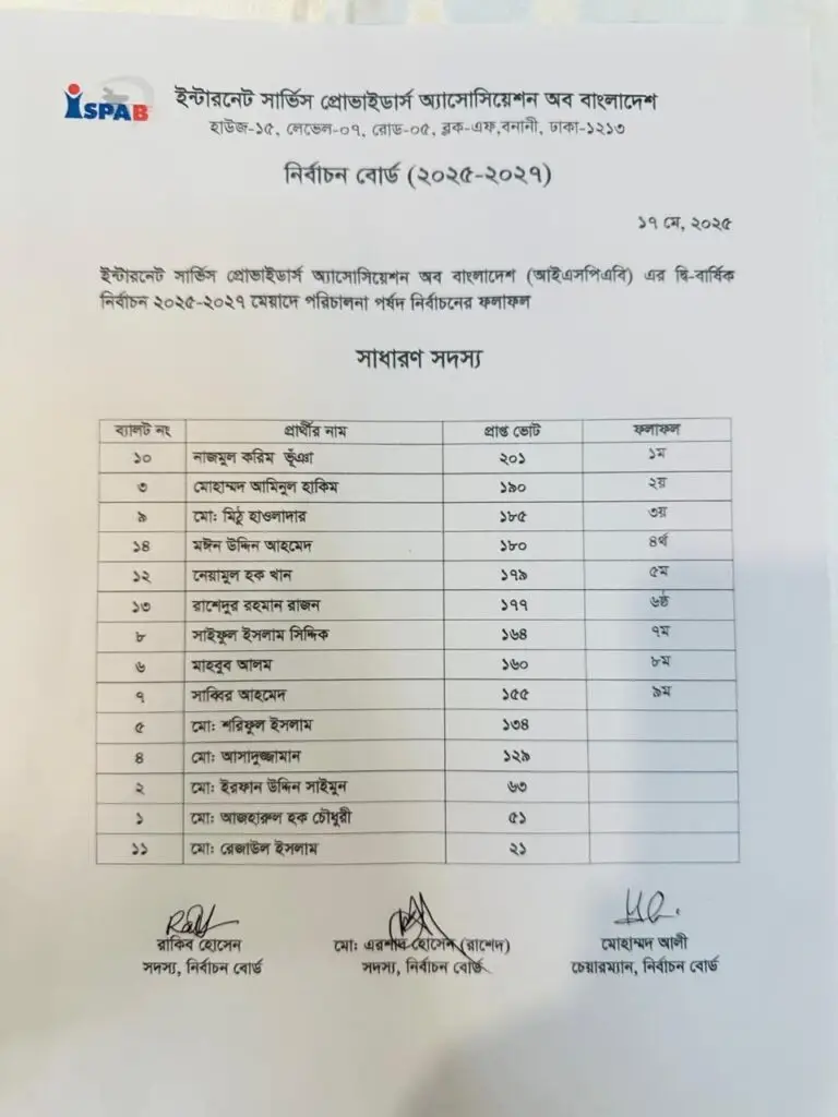আইএসপিএবি’র ২০২৫-২৭ মেয়াদের নির্বাচনে সাধারণ সদস্য ক্যাটাগরিতে ২৬৩ জন ভোটারের মধ্যে ২২৯ জন ভোটার ভোট প্রদান করেছেন। ভোট বাতিল হয়েছে ৮টি এবং বৈধ ভোট ২২১টি। সহযোগী সদস্য ক্যাটাগরিতে ৬৬৩ জন ভোটারের মধ্যে ৫৫৭ জন ভোটার ভোট প্রদান করেছেন। ভোট বাতিল হয়েছে ৭টি এবং বৈধ ভোট ৫৫০টি।