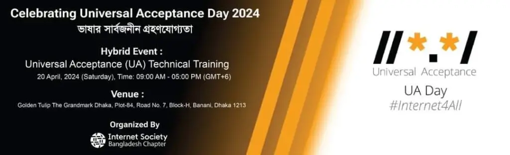 টেকসিঁড়ি রিপোর্টঃ ইন্টারনেট সোসাইটি (আইসক) বাংলাদেশ চ্যাপ্টারের আয়োজনে আগামী ২০ এপ্রিল, ২০২৪; শনিবার ঢাকায় (গোল্ডেন টিউলিপ-দ্য গ্রান্ডমার্ক-ঢাকা, প্লট-৮৪, রোড নং-৭, বøক-এইচ, বনানী, ঢাকা-১২১৩) অনুষ্ঠিত হতে যাচ্ছে দিনব্যাপী ইউএ টেকনিক্যাল ট্রেনিং ফর ইঞ্জিনিয়ার্স এন্ড সফটওয়্যার ডেভেলপার্স শীর্ষক আয়োজন। ইউনিভার্সেল একসেপ্টেন্স (ইউএ) স্টিয়ারিং গ্রুপ এবং ইন্টারনেট করপোরেশন ফর অ্যাসাইনড নেমস অ্যান্ড নাম্বারস (আইক্যান) এর সহযোগিতায় পালিত হতে যাচ্ছে সর্বজনীন গ্রহণযোগ্যতা (ইউনিভার্সেল একসেপ্টেন্স) দিবসের এই আয়োজন।