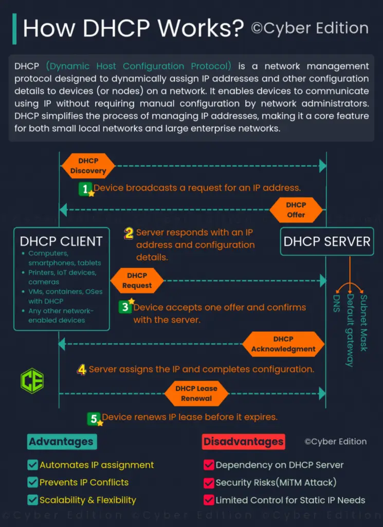 DHCP (Dynamic Host Configuration Protocol) একটি নেটওয়ার্ক প্রোটোকল যা যেকোন নেটওয়ার্ক ডিভাইসকে স্বয়ংক্রিয়ভাবে আইপি এড্রেস প্রদান করে থাকে। এটি নেটওয়ার্ক অ্যাডমিনিস্ট্রেশনের একটি গুরুত্বপূর্ণ অংশ এবং এটি নেটওয়ার্ক পরিচালনাকে অনেক সহজ করে তুলে।